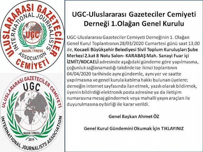 UGC-Uluslararası Gazeteciler Cemiyeti Derneğinin 1. Olağan Genel Kurul Toplantısının 28/03/2020 Cumartesi günü saat 13,00 de, Kocaeli Büyükşehir Belediyesi Sivil Toplum Kuruluşları Şube Merkezi 2.kat 8 Nolu Salon- KARABAŞ Mah. Sanayi Fuar içi İZMİT/KOCAELİ adresinde aşağıdaki gündeme göre yapılmasına, çoğunluk sağlanamadığı takdirde ise ikinci toplantının 04/04/2020 tarihinde aynı gündemle, aynı yer ve saatte yapılmasına ve genel kurula katılma hakkı bulunan üyelere; derneğin internet sayfasında ilan etmek, yazılı olarak bildirmek, üyenin bildirdiği elektronik posta adresine ya da iletişim numarasına mesaj göndermek veya mahalli yayın araçları ile duyurulmasına oy birliği ile karar verildi.